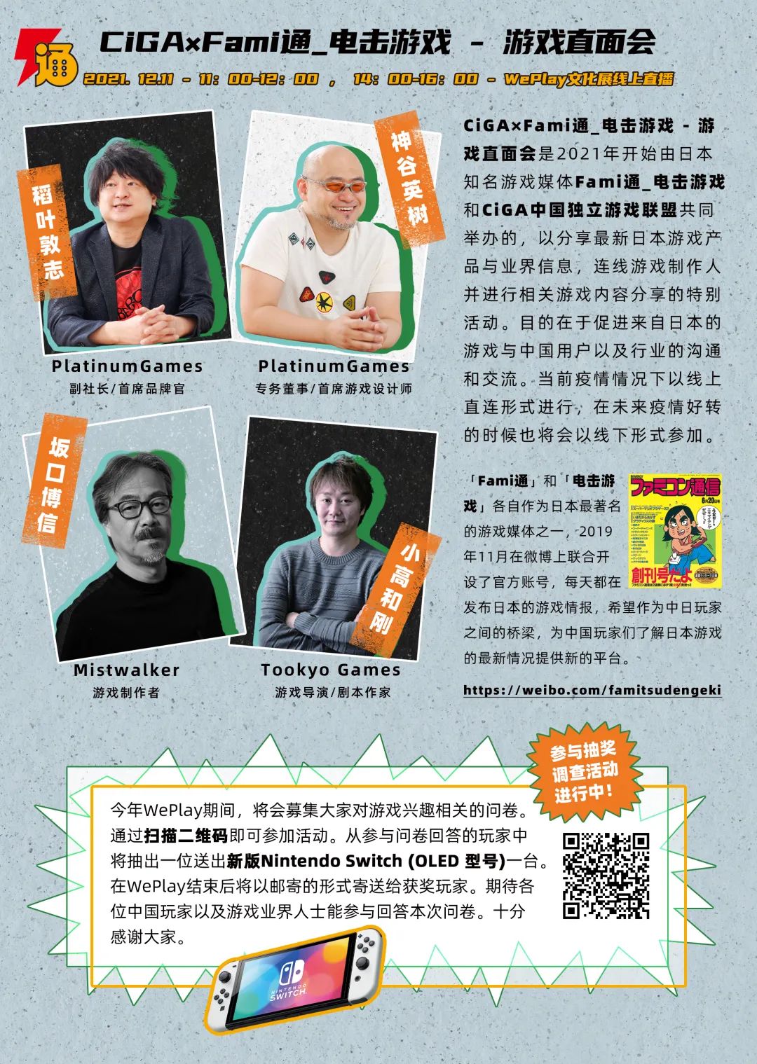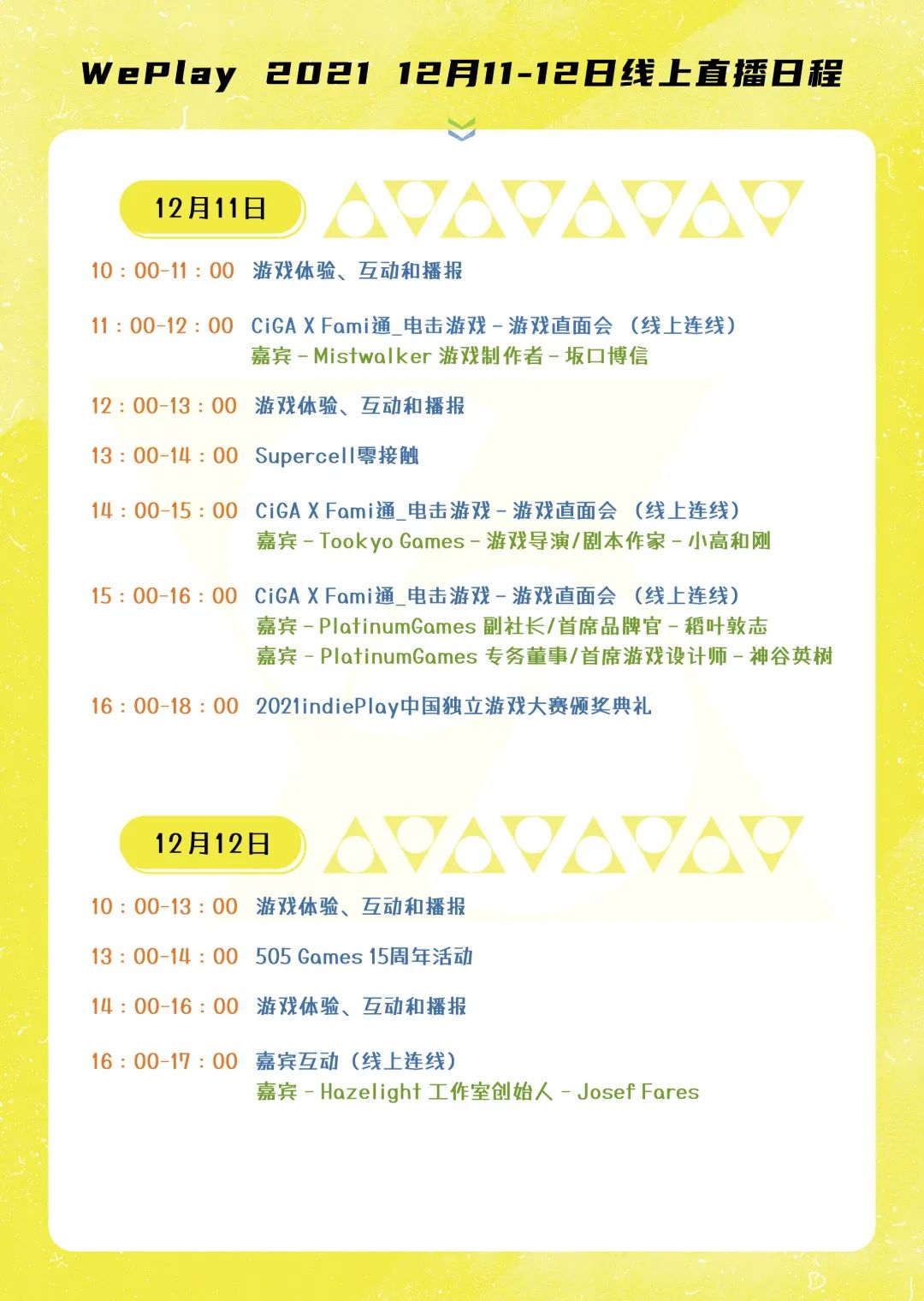 在周末的2天直播规划中,第一天12月11日我们会设置小型的迷你现场,第二天则将回归到直播间,在2天的游戏播报环节中,将有原定于线下展出的多款游戏的在线播报,并有一些最新信息放出,关注新产品动向的观众们注意锁定相关时间,目前计划播报的作品有很多,正在紧张筹备中。而此前让大家很兴奋的嘉宾连线部分会继续进行,通过和Fami通_电击游戏合作的游戏直面会,邀请到了重量级的游戏嘉宾 -坂口博信、小高和刚、稻叶敦志和神谷英树,12月11日更是有现场和嘉宾连线互动的机会哦!